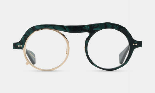 An experimental design in which each part is stacked one by one. Try to place end pieces and bridges freely like building blocks. This forms the structure and creates the eyewear. The combination of parts of different colors and textures creates intricate palette and the illusion of trompe l’oeil.